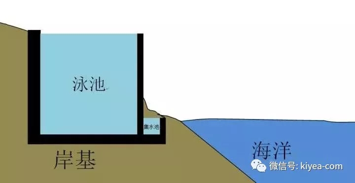 原理:無邊泳池的邊在水面以下,水池背面加落水槽,水漫過泳池邊流向落水槽,落水槽收集池水至底部的集水池,集水池將水過濾后重新輸入泳池。同時,為了讓水在視覺上是鋪滿的,邊界有一個向里的坡度,視覺上,我們看到的是靜止?fàn)顟B(tài),感覺是無邊緣的,然而背后落水槽的池邊,當(dāng)水面不處于靜止,池邊的水流還會像嘩啦啦的瀑布一樣流到集水池。